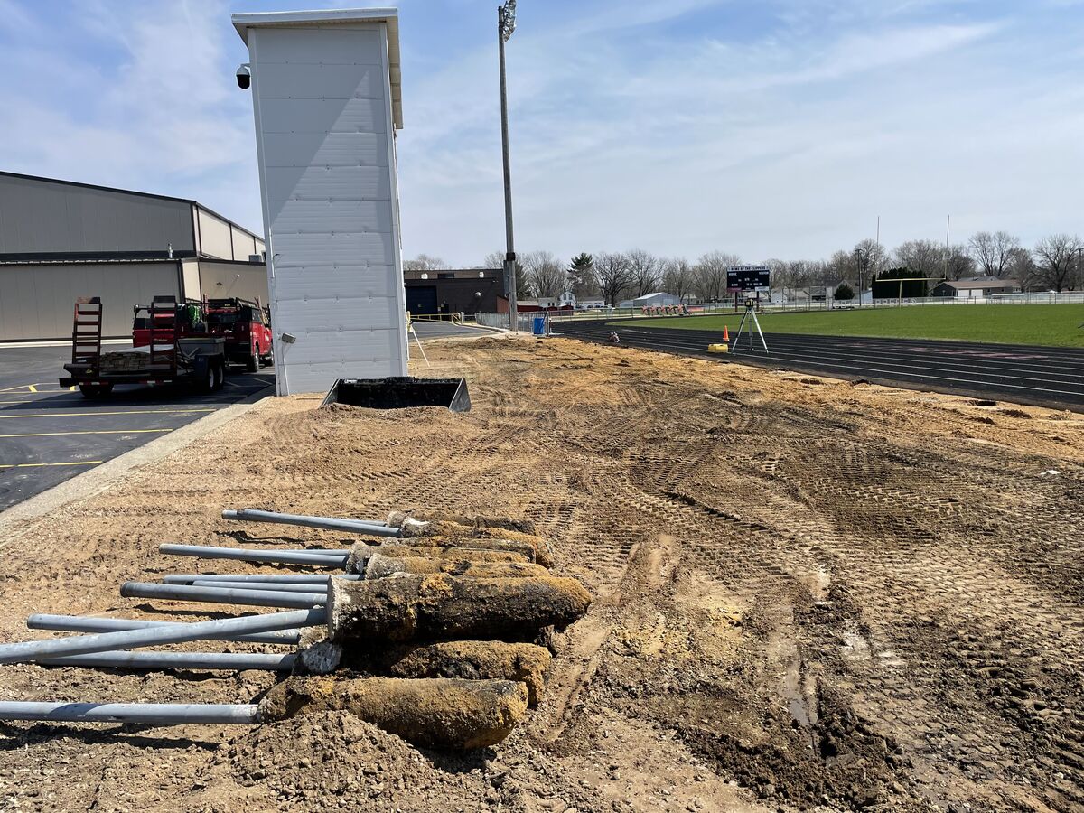 The construction process has already started. If you attend a track meet this Spring, you will need to either bring a chair to sit in or take advantage of some small bleacher sections that the Lee County Fair Board has loaned us, which are located on the gravel on the West side of the field.